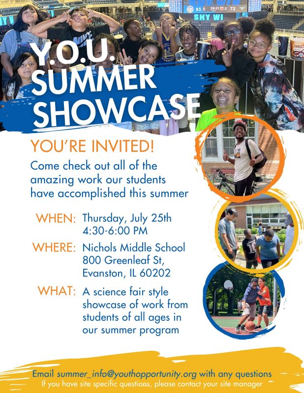 Come out to support Y.O.U. youth this Thursday during our Summer Showcase! Expect a "science fair" style event where our kids will be presenting their accomplishments from summer program. This free event, held at Nichols Middle School (800 Greenleaf Strett) will consist of exciting demos of dance, music, drama, cooking, and so much more. Bring your family and friends for a great time.